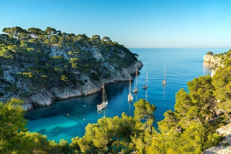 Dieser exquisite Teil der französischen Küste ist mit seinen engen Felsschluchten, die zu geheimen Stränden und abgelegenen Lagunen führen, ist wie gemacht für Bootsfahrten. Das Wasser ist unfassbar blau, während das von den Felsen reflektierte Licht für beneidenswerte Urlaubsfotos sorgt.