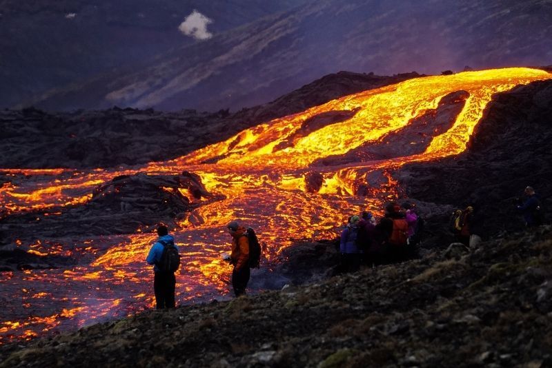 Die Vulkantouren in Meradalir für Fortgeschrittene kosten ca. 85 € pro Person, während die geothermischen Touren in Reykjanes etwa 90 € pro Person kosten. Tagesausflüge nach Meradalir und zur Blauen Lagune ab Reykjavík kosten ca. 170 € pro Person.
